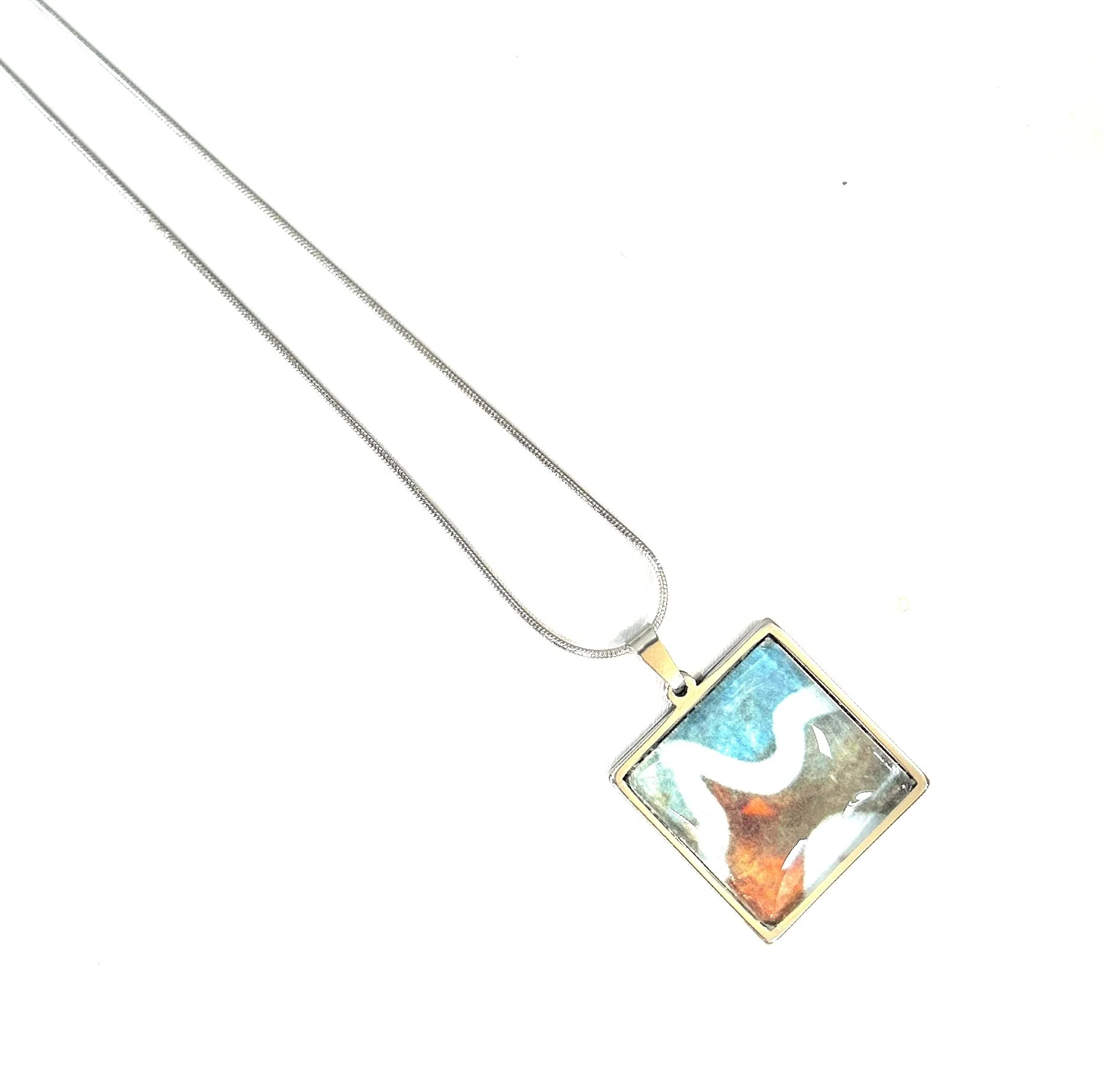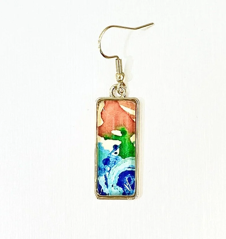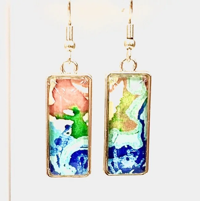 This listing is for a pair of earrings (#25-05), 1cm in width by 2.5cm in total length. It is in shades of purples, lilacs, pinks, and periwinkle blue, cut and repurposed from an upcycled print of my mixed media painting, “The Deep.” The cardstock is sealed with acrylic and installed between a glass cabochon and a rose gold-tone alloy metal bezel tray with surgical steel alloy “fish hook” posts. The three components are then combined with various adhesives. Adhesives and resins used in my jewelry work often become an additional medium of the piece, lending further texture and dimension.
